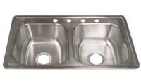 Double Bowl - 33" length x 19" width x 8" bowl depth. Two 3 1/2" outlets for basket strainers. Faucet holes set-up for 8" on center faucet with 4th hole for optional sprayer, soap dispenser or hot water dispenser.